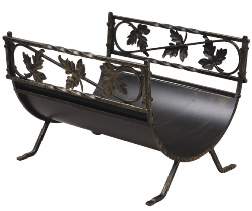 Стиль и элегантность дровниц данной модели покорили многих владельцев каминов. Оформленное в классическом стиле изделие декорировано ажурным поясом из кованых листьев, сплетенных в сквозной орнамент. Удлиненный корпус приподнят над поверхностью на кованых ножках, что визуально делает дровницу намного легче, изящнее. Данную модель стоит приобретать не только как функциональную вещь, гармонирующую с прочими аксессуарами для камина (защитным экраном, каминным набором). Помимо того, что изделие считается весьма практичным, дровница является также самостоятельным элементом декора. Изделие выполнено в черном цвете с добавлением отделки оттенка античного золота.