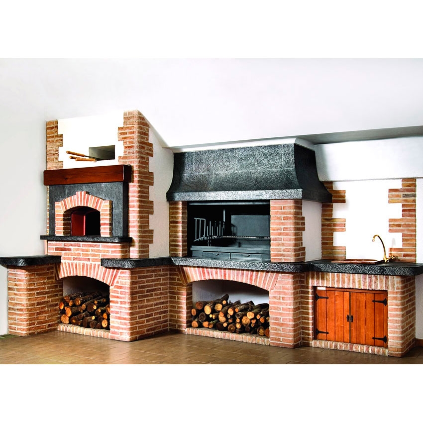 Комбинированная барбекю из кирпича, плиты из несимметричного сланца Pizarra. Центральная часть духовки, быки, металлические плиты и короб рустикальной обработки. Дверцы и балка из дерева обработки Iroko. Духовка размером 110 см, металлическая топка размером 120х65 см, зольник и решетка для жарки с направляющими, вертикальный гриль сбоку.