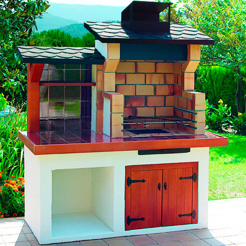 Барбекю с пристроенным модулем из конгломерата белого цвета, с нишей для дров и дверцами из обработанного дерева. Плита и центральная стенка из греса, быки, полочки и крепежи из обработанного дерева. Топка из огнеупорного кирпича, зольник с решеткой, решетка для жарки с направляющими. Металлические козырек и короб, покрашенные в черный цвет. Верх барбекю из конгломерата черного цвета, иммитация песчаника Pizarra.
