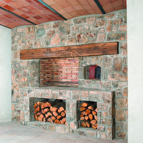 Комбинированная барбекю из горного нессимметричного камня с цементным швом. Топка из огнеупорного кирпича, решетка для жарки с направляющими и зольник встроены в нижнюю часть топки. Духовка диаметром 110 см. Балка из сосновых пород в рустиковом стиле.