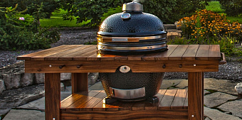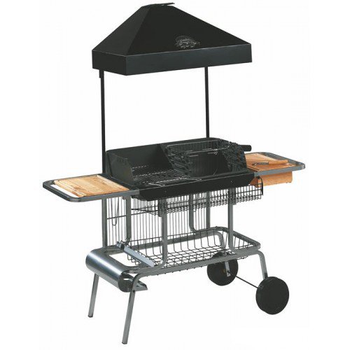 Большой контейнер очага. Легкая мобильная металлическая платформа. По бокам две деревянные полочки-рабочие поверхности. Несколько вариантов регулировки решетки по высоте. Решетка для разогрева, подставка для посуды. Разнообразные варианты положения шампуров. Нижний сервировочный столик. Решетки, двигатель, вертел в комплекте поставки.