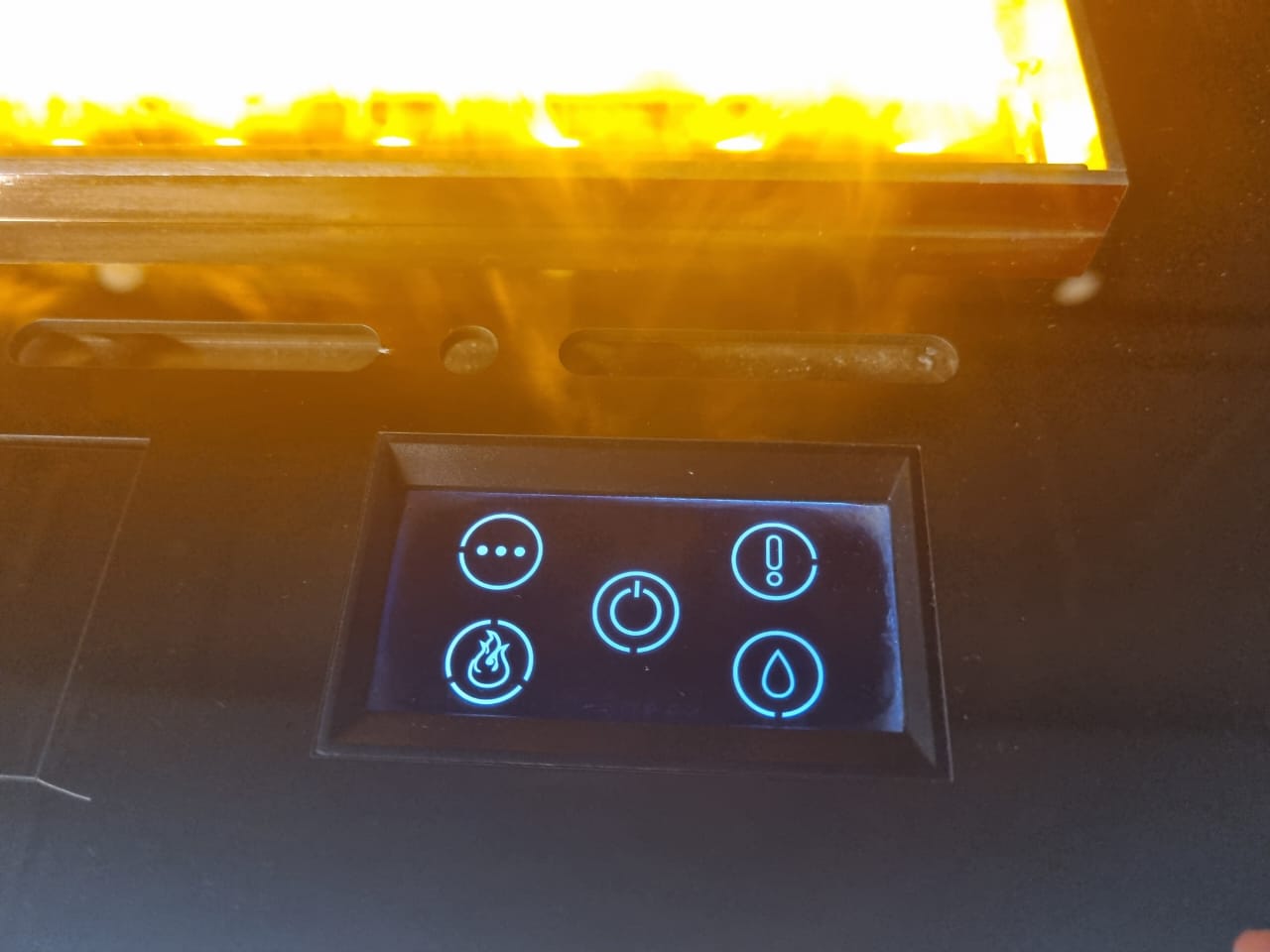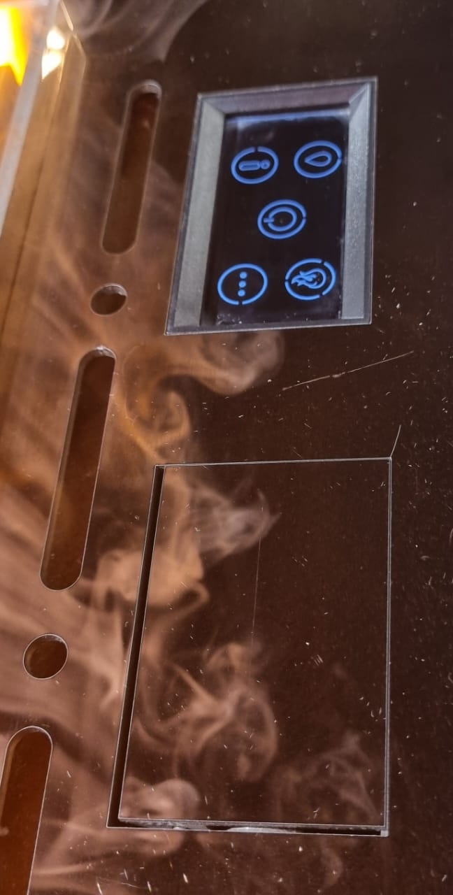 На верхней панели расположен сенсорный экран, с которого можно управлять функциями очага. Также элементы управления дублируются на пульте дистанционного управления. Он дополнительно оборудован экраном, на котором отображается режим работы и текущий статус камина.