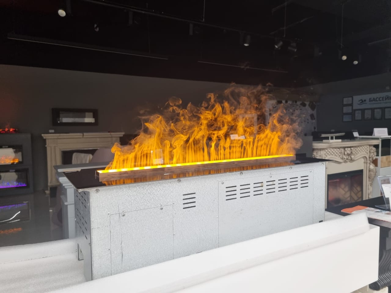 Производитель предлагает на выбор целый ряд стандартных длин. Это позволит подобрать оптимальный вариант для установки практически в любом месте. Три уровня регулировки интенсивности эффекта пламени и его высоты позволит настроить камин под себя. А дополнительный эффект достигается за счет звука потрескивания дров.