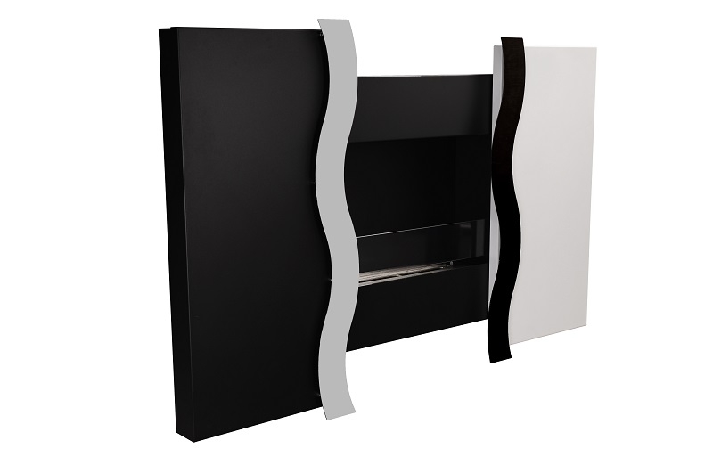 - Дизайнерское панно превращается в современный биокамин благодаря системе раздвижных дверок, скользящих по слайдам на шарикоых подшипниках.