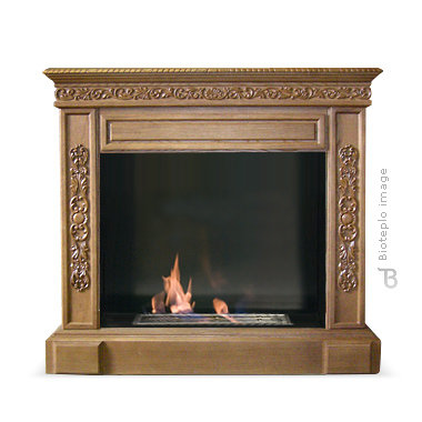 Узкая фронтальная часть портала придает дизайну биокамина дополнительную визуальную легкость и утонченность. Портал изготовлен из массива натурального дерева и украшен резным цветочным орнаментом по передней и боковым частям.