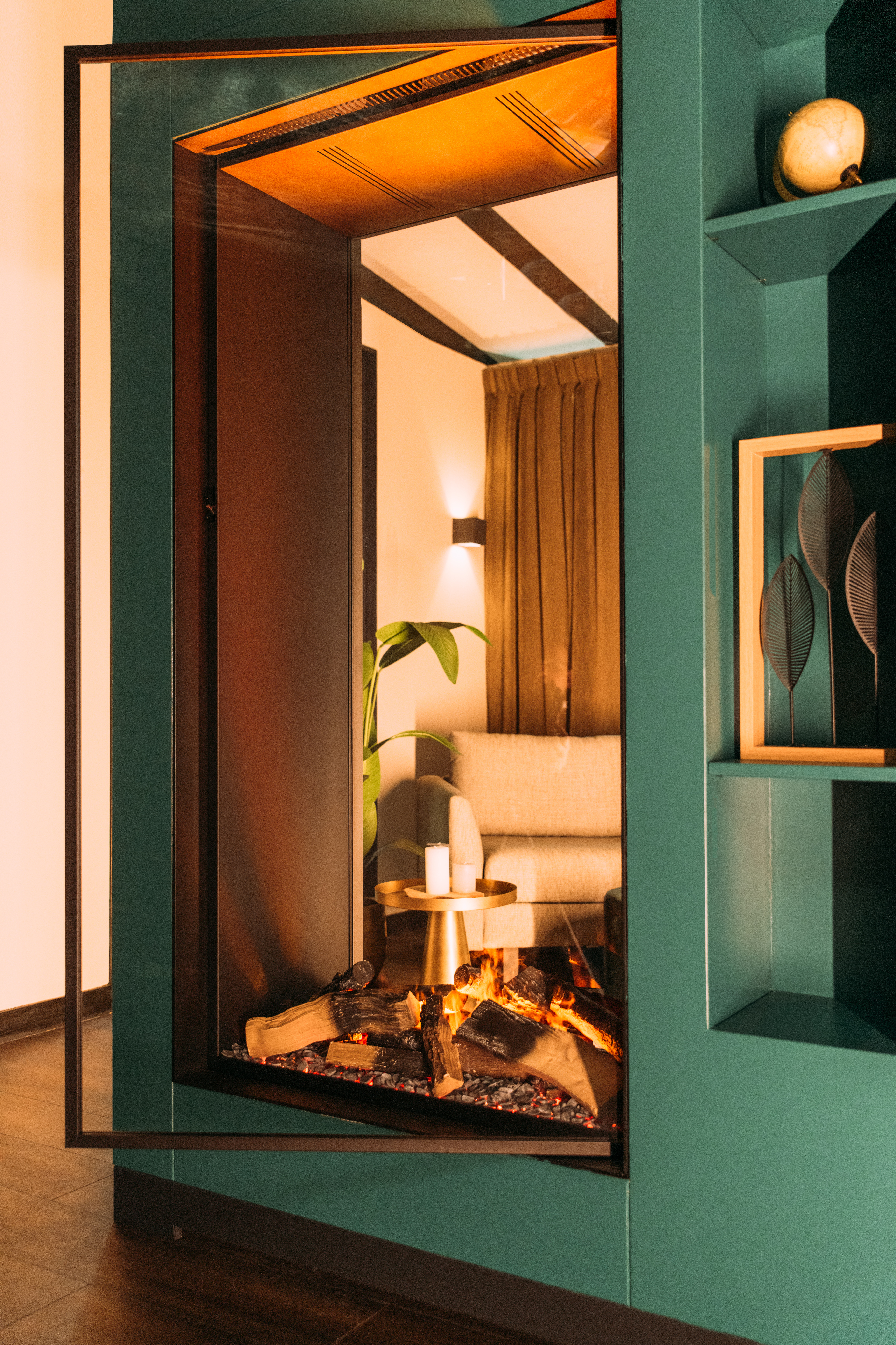 Модель имеет закрытую конструкцию газового камина с тремя стеклами для панорамного обзора пламени и с зеркальной задней стенкой для увеличения объема топки. В общественных зонах, ресторанах, а также в других пространствах с большим потоком людей такое решение сохранит первозданный вид очага. Стекла в модели быстросъемные, благодаря чему можно быстро и без демонтажа получить доступ к топочной корзине, чтобы дополнить ее декоративными элементами по вкусу.