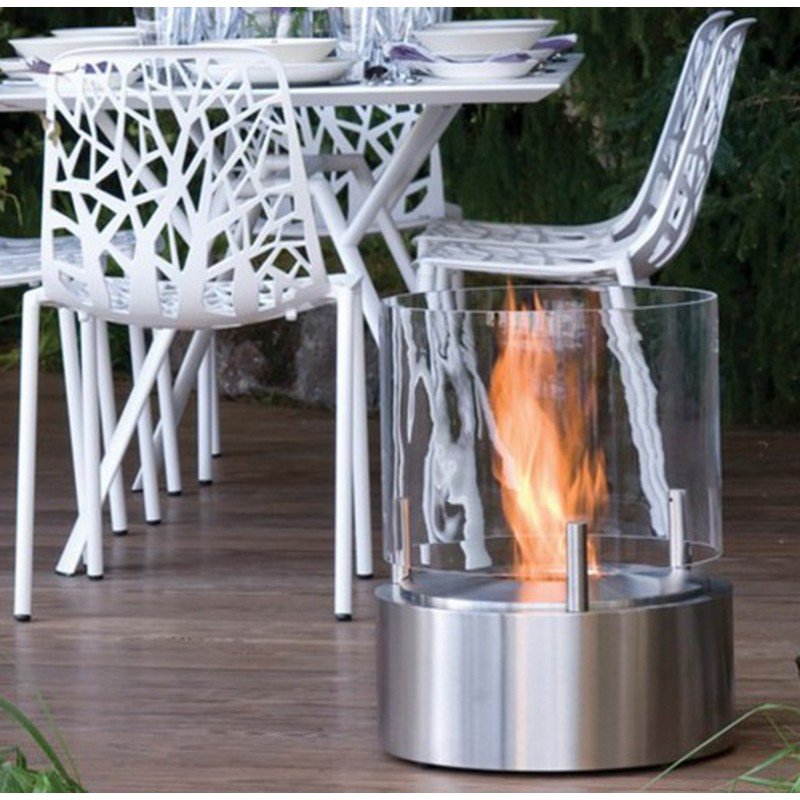 Круглое металлическое основание окружает 2,5-литровую горелку из нержавеющей стали. Объем создает закаленное стекло, охватывающее пламя и поднимающееся над основанием на трех стальных ножках. Это способствует появлению высокого и яркого пламени.