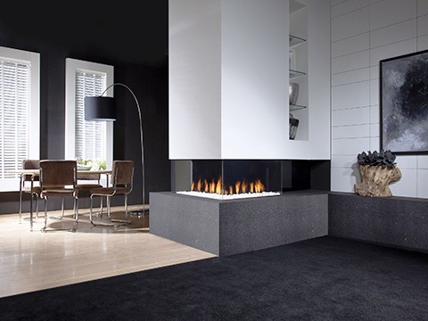 Газовый камин Faber Respect OC представляет собой угловую конструкцию, способную открыть прекрасный вид на горящее внутри пламя сразу с двух сторон. Такой вариант камина отлично подойдет для оформления больших домов со сложной планировкой или зданий коммерческого назначения. Очень оригинально выглядят островные конструкции, в которые встраивается топка.