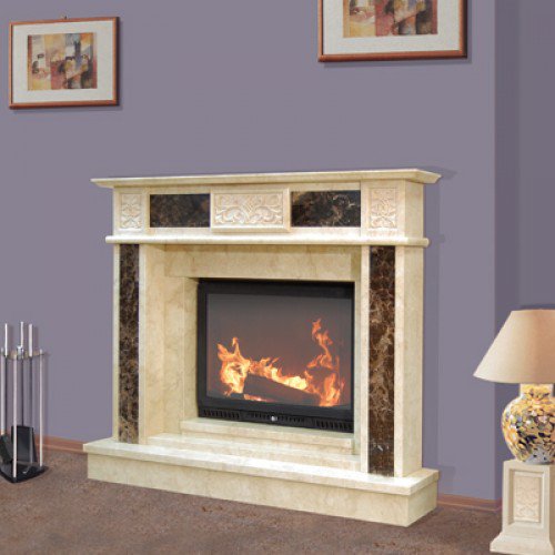 Каминная облицовка ВЕНА изготовлена из натурального полированного мрамора. Основная часть конструкции кремового цвета "Крема Нова" украшена вставками «Имперадор Дак» коричневых оттенков. Верхняя часть камина выполнена в виде полки.