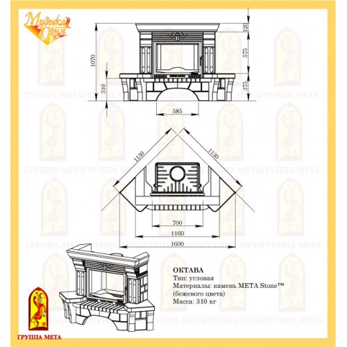 Каминная облицовка Октава выполнена в монохромной гамме из камня Meta Stone™ для угловой модели отопительной печи. Предназначена для оформления топок российского и импортного производства с шириной фасада 700 мм.