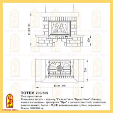 Облицовка камина Тотем изготовлена по новым технологиям из натурального мрамора "Галала" или "Крем Нова", камня на корпусе - травертин "Оро" и желтого доломита. Балки изготовлены из МДФ с натуральным дубовым шпоном. Данная облицовка может обогреть помещение в дачном доме, коттедже до 150 м2, в зависимости от выбранной топки.