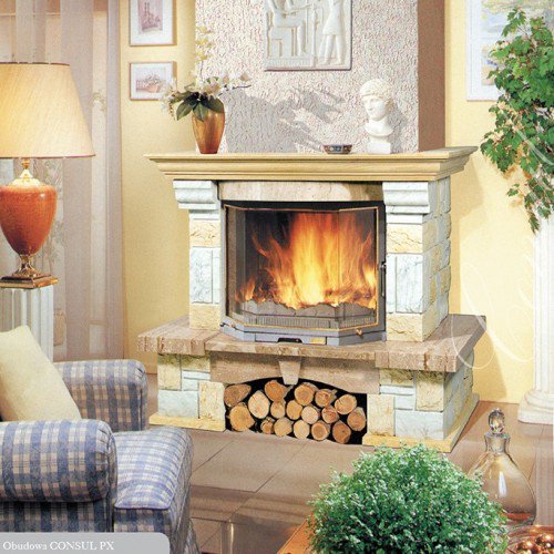 Колоритная каминная облицовка Bella Italia Consul олицетворяет оригинальный творческий поход польских дизайнеров, умело воплощающих классические очертания, оптимальную геометрию и эффектную цветовую палитру. В оформлении облицовки задействованы два вида колотого мрамора белоснежного и солнечного оттенков. На контрасте смотрятся деревянная балка, исполняющая роль каминной полки, и декоративные элементы, изготовленные из двух сортов высококачественного полированного мрамора. Пляшущие язычки живого пламени, облаченные в столь праздничную облицовку, идеально впишутся в интерьер квартиры или частного дома.