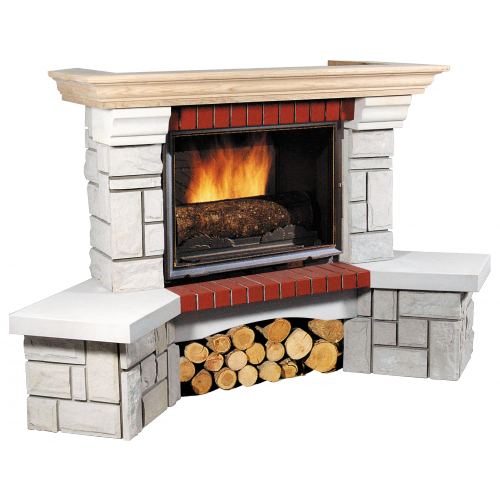В оформлении грациозной каминной облицовки Bella Italia Stella задействованы два вида природного песчаника мягкого белоснежного оттенка. Классические очертания портала, ювелирно высеченного из колотого природного камня, гармонично сочетаются со шлифованной горизонтальной плитой и арочным обрамлением вместительного дровника. Естественность и непринужденность кантри-стиля выдержаны также в декоративной деревянной балке, успешно исполняющей роль каминной полки. Контрастные клинкерные кирпичики, обрамляющие верхнюю и нижнюю грани топки, довершают дизайн портала, насыщая игру живого огня дополнительной гаммой оттенков.