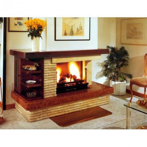 Фронтальный камин из мрамора грубой обработки Crema - кладка лозете. Плита из полированного красного мрамора Rosso Forte. Боковой пилар и консоль из полированного Crema Marfil. Деревянные балка и полочки. Металлическая топка 070, открытая сбоку, с колосником и зольником.