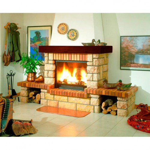 Фронтальный камин из мрамора Rosa Dorado грубой обработки со швом. Плита и консоль из огнеупорного кирпича толщиной 5 см. Деревянная балка из Iroko. Металлическая топка 904 с зольником и колосником.