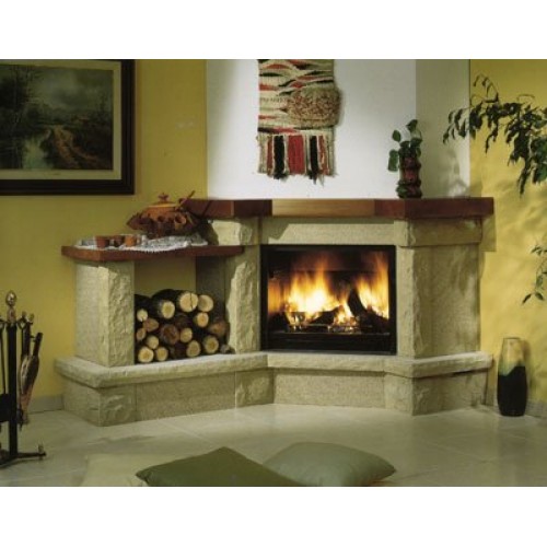 Угловой камин серии Stylo из песчаника Arenisca в сочетании грубой обработки и обработки бучардой. Металлическая топка 904, колосник и зольник.