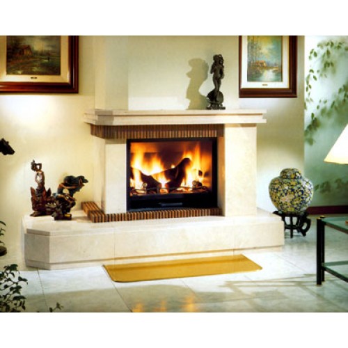 Фронтальный камин из полированного Crema Marfil. Плита и консоль из огнеупорного кирпича толщиной 1,5 см. Асимметрично удлиненная плита. Металлическая топка 904 с колосником и зольником.