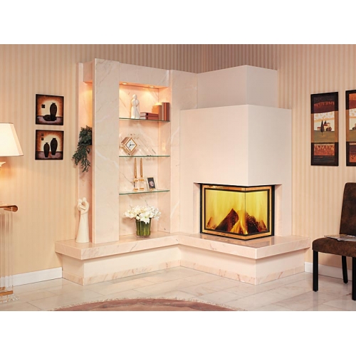 Угловой мраморный камин из мрамора Estremoz poliert. 4 стеклянные полки с креплениями и набор светильников (3 шт.) включены в стоимость.