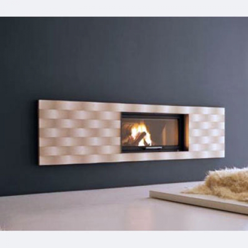 Реверсивный камин Palazzetti Perth из матового Bianco Mediterraneo с эффектом волн. Внутренняя рамка - окрашенная серая сталь.