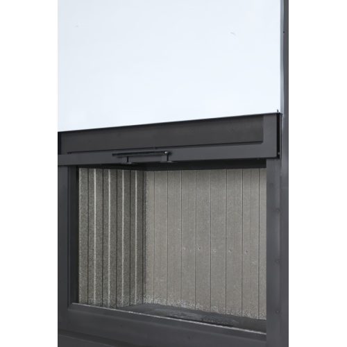 Печь «Vega 1000 МВ» с шамотом черного цвета, снабжена механизмом вертикального открывания двери, элементы которого выполнены из легированных и качественных сталей и сплавов. Для удобства отчистки стекла предусмотрено откидывание двери на 30°. Стекло закалённое толщиной 4мм с принтингом по периметру. Флажок регулировки подачи воздуха расположенная под дверцей обеспечивает открытие заслонки подачи воздуха на систему «Чистое стекло» и вторичный дожиг в первой половине хода флажка (см сектор на ключе) после чего открывает дополнительную заслонку, через которую воздух подаётся на колосник. Передвигая флажок ключом, больше - меньше показано на ключе в виде сектора, можно добиться желаемого уровня горения.