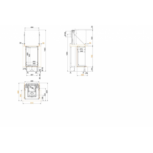 Трёхсторонняя каминная топка. Топочная камера футерована шамотом. Подъёмный механизм двери (система Easy-Lift). Ширина дверки 248/405/248 мм, высота - 669 мм. Возможно подключение воздуха из-вне.