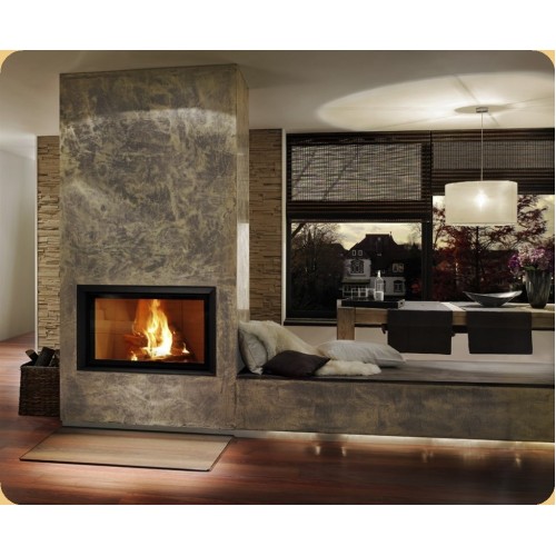 Каминная топка с прямым стеклом. Топочная камера футерована шамотом. Подъёмный механизм двери (система Easy-Lift). Ширина дверки 850 мм. Высота дверки 484 мм. Возможно подключение воздуха из-вне. В комплекте поставляется декоративная или монтажная рамка.