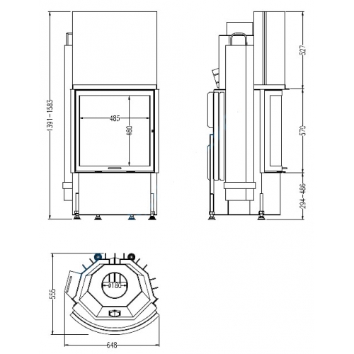 Топка Hark Radiante 600/57 RH имеет полукруглое стекло, обзор 180°-, вертикальное и боковое открытие, футеровка-шамот, рамка дверцы латунная, хромированная, чёрная или золотая (по выбору).