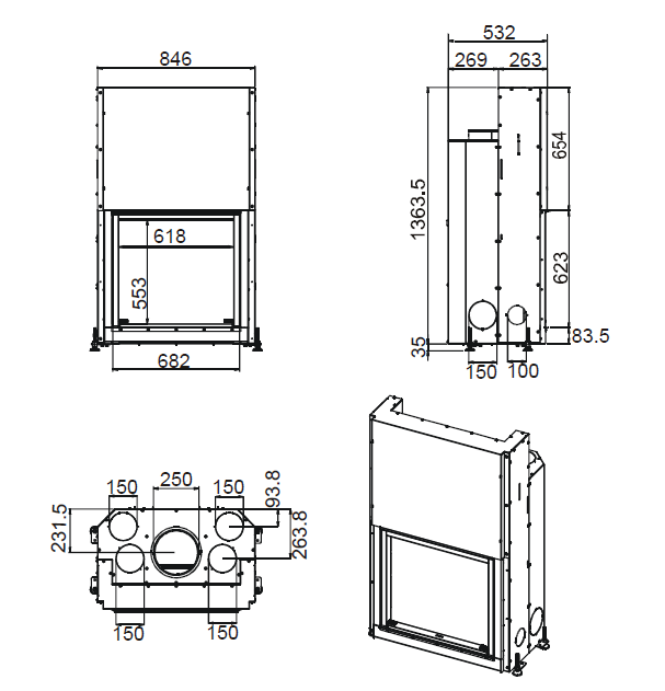 - Воздухозаборник топки с диаметром 150 мм. Расположен сзади, позволяет легко подключить внешний воздуховод на подачу необходимого для горения воздуха с улицы, а не из помещения. Это позволяет устройству работать вне зависимости от условий вентиляции в помещении и в помещениях с плохим обменом и циркуляцией воздуха.
