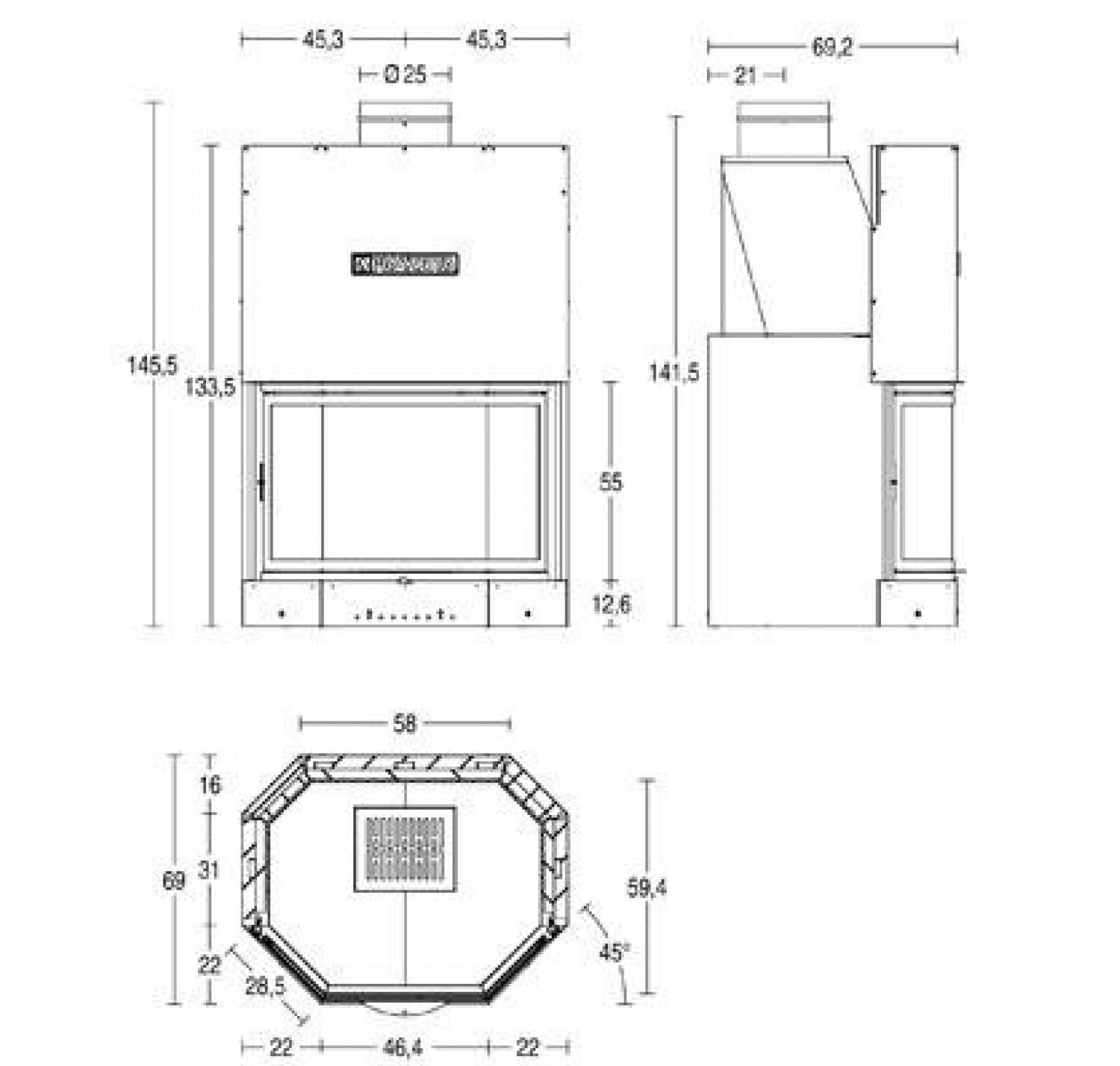 Топка имеет призматическое стекло. Подъемная дверца с жаропрочным стеклом, что позволяет наслаждаться открытым огнем, которая открывается на петлях для чистки. Стальной кожух и внутреннее основание из чугуна обеспечивают прочность и долговечность. Имеет современный дизайн.