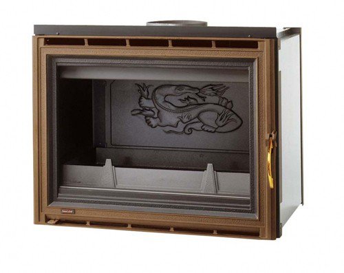 Топка-вставка для камина, выполненная из толстого чугуна. Дверца с бронзовой рамкой. Прямое керамическое стекло для обзора огня. Система очистки стекла.