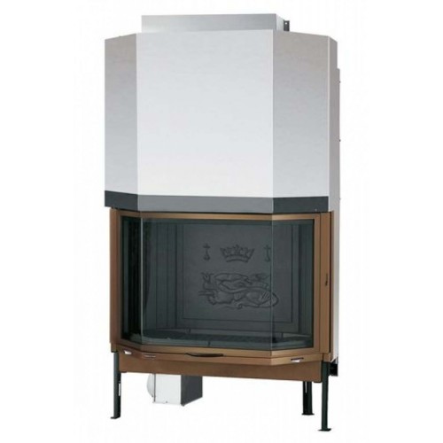 Каминная топка призматической формы, выполненная из толстостенной стали. Внутренние стенки и низ очага из толстого чугуна. Дверь с декоративной каймой из латуни. Дверь открывается вверх. Чугунная колосниковая решетка.
