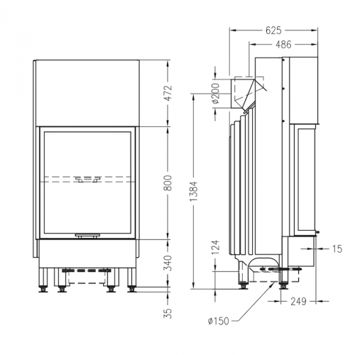 В топке имеется система длительного горения и система чистого стекла. Имеется возможность для подвода дополнительного воздуха из других помещений или улицы для процесса горения, что сводит к минимуму выжигание кислорода в помещении во время работы камина.