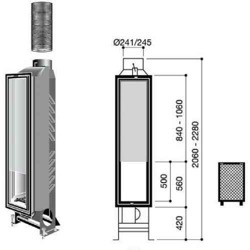 Камин, представляющий собой единое целое, самоподдерживаемая конструкция из стали марки Indaten (140 кг), широкий фасад с боковыми петлями и постоянно открытой нижней частью, что делает из данной модели камин с открытой топкой. Вентиляция обеспечивается засчет большого пирокерамического стекла. Рама обеспечивает изоляцию от окружающих поверхностей. Верхние и нижние вентиляторы обязательны.Гарантирована эффективность при минимальной длине трубы (внутренней и внешней) в 3,5 м.
