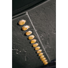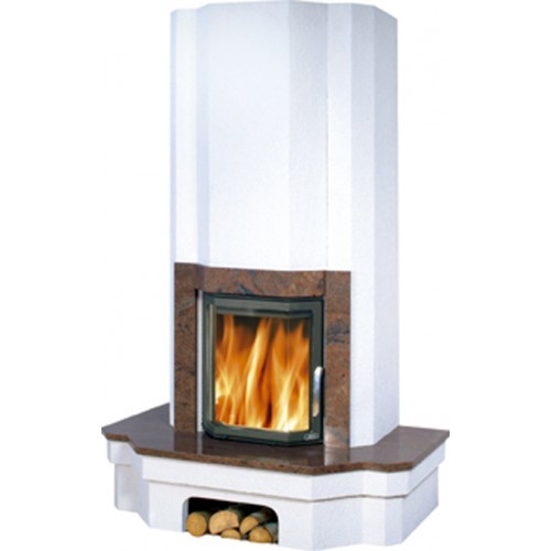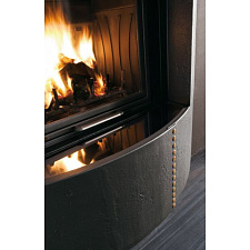Основание камина выполнено из металлокерамики (огнестойкой стали с нанесением специальной мастики), а столешница и детали сопряжения с топочной камерой - из натурального гранита. Вытянутый прямоугольник конвекционной камеры имеет обтекаемые формы и сочетается с трехгранным стеклокерамическим окном топки и скругленным вырезом небольшой открытой дровницы.