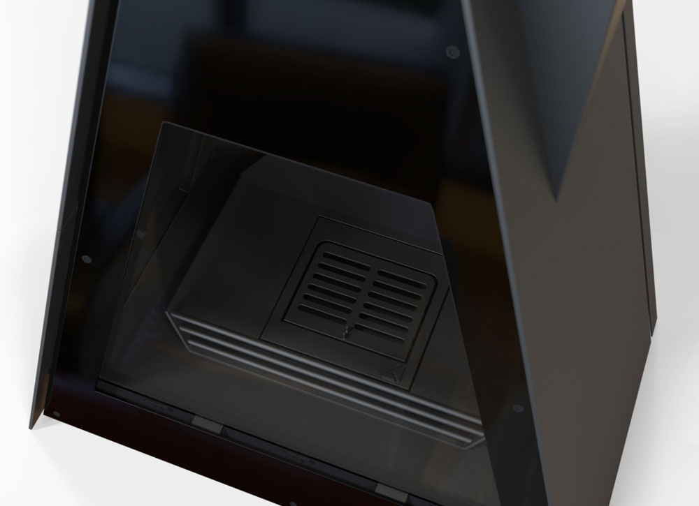 В зависимости от общего оформления интерьера каминной залы, вы можете выбрать наиболее подходящий цвет фронтальной облицовки. Любопытная треугольная форма камина отсылает наблюдателя к конструктивистским стилевым тенденциям прошлого века, получившим новое рождение в современном, а точнее даже футуристическом исполнении.
