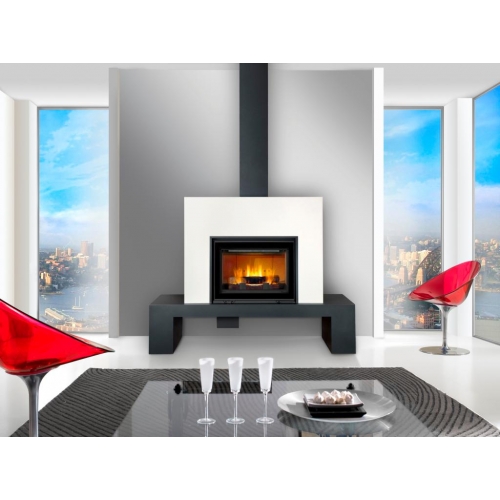 Металлический камин в стиле хай-тек. Белая стальная рамка и черная скамья-дровница придают камину неповторимый стильный вид. Топка HP700 с прямой стеклянной дверцей в комплекте.