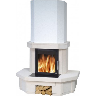 Основание печи выполнено из металлокерамики: огнестойкой стали с нанесением специальной мастики, цоколь из натурального песчанника. Вытянутый корпус конвекционной камеры имеет обтекаемые формы и сочетается с трехгранным стеклокерамическим окном топки и закругленным вырезом небольшой открытой дровницы.