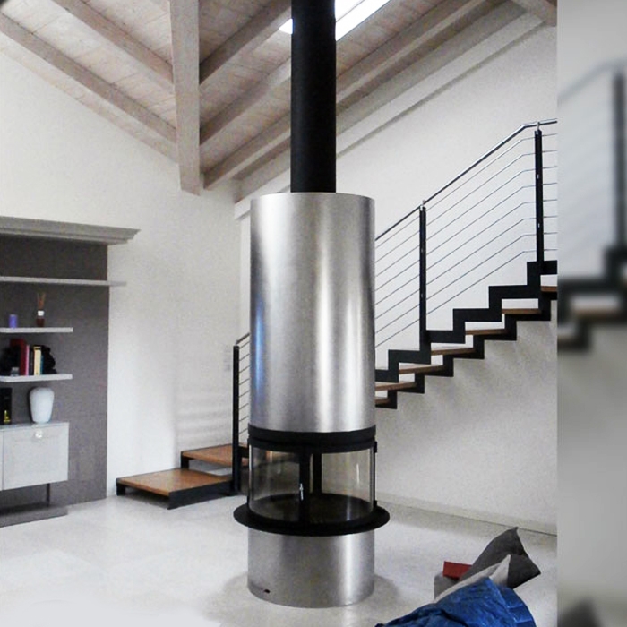 Центральный камин цилиндрической формы, с двойным корпусом. Составное стекло из 4 полукруглых частей. Выполнен из нержавеющей стали.