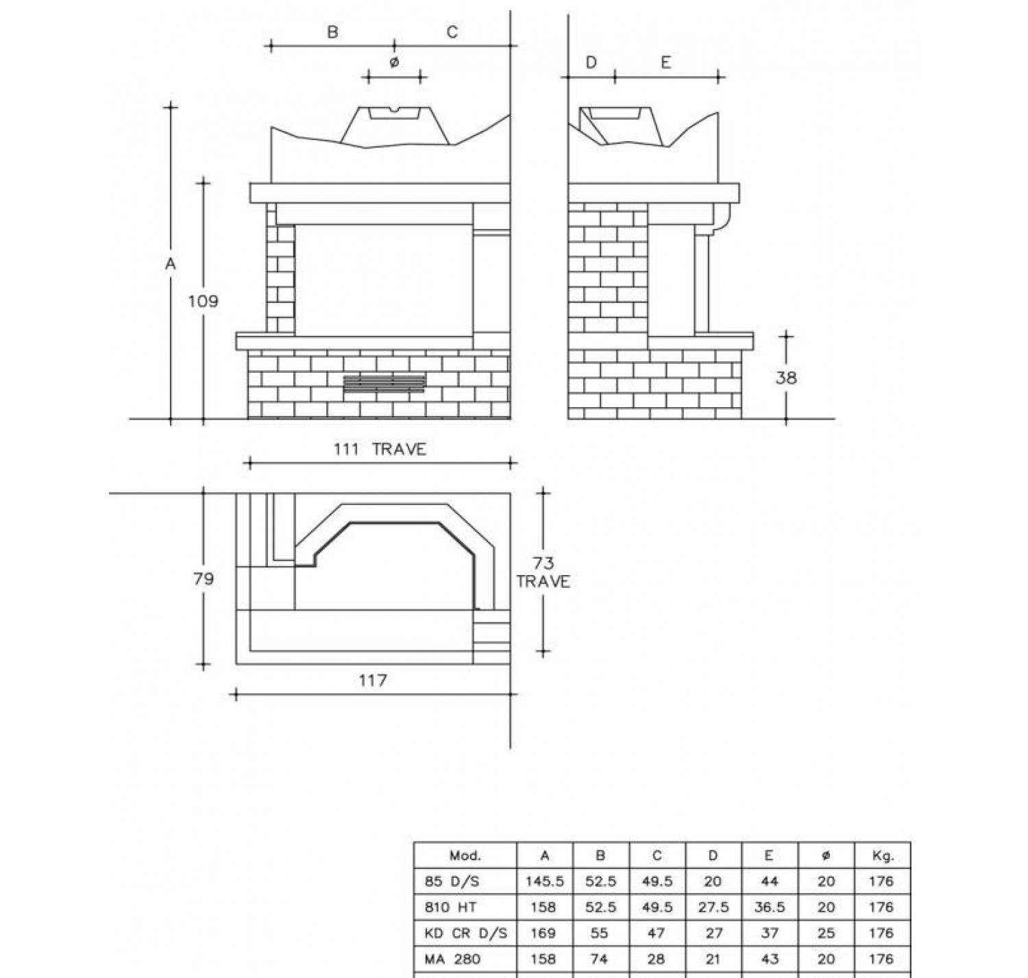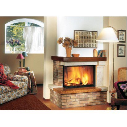 Облицовка из глиняного (необожженного) кирпича. Очаг, полка и модильон из гладкого камня Giallo dIstria. Балка из из древесины ели. На фото представлена модель с дровяной топкой HT 810. Dx - стекло слева Sx - стекло справа Техническая информация