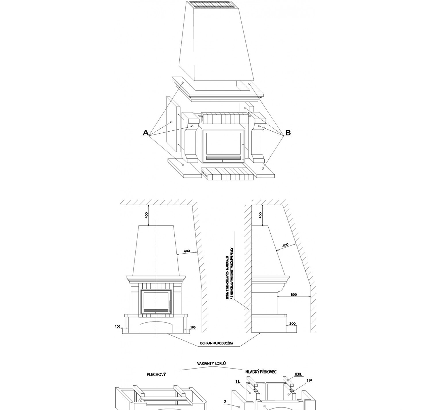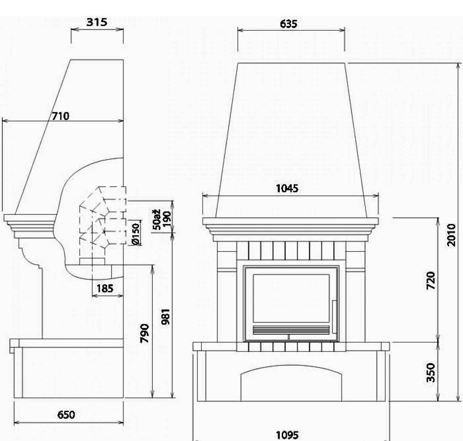 Данная модель камина относится к рустикальному (деревенскому) стилю, для облицовки которых используются натуральные материалы с неровной шероховатой поверхностью, а конструкция предполагает высокий дымоходный колпак и каминную балку. Белый кожух поставляется в комплекте. Высота термокороба составляет 270 см. При монтаже камина в коробе необходимо установить дополнительные вентиляционные решетки.