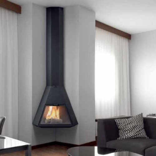 Подвесной угловой камин серого цвета, включая крепеж. Дверца со стеклом, включает телескопический элемент.
