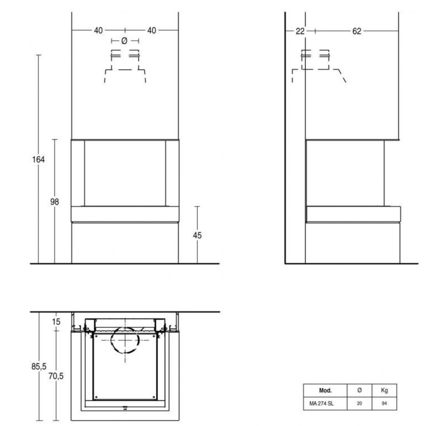 Облицовка камина довольно компактна и хорошо подходит для комнат с небольшой площадью. Основание камина сделано из мрамора, стальной вертикальный элемент отделан черной эмалью. Топка имеет три панели из огнеупорного стекла, что позволяет особенно подчеркнуть красивый вид пламени. Камин совместим с топками: MA 274 SL.