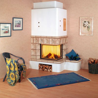 Пристенно-угловой камин из изразцов.