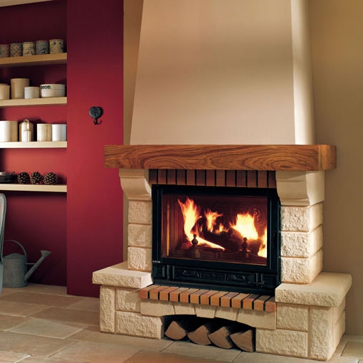 Пристенный камин из золотисто-песочного Edelroc + топочная плита из кирпича + балка из экзотической породы дерева. Балка из экзотического дерева. Облицовка устанавливается вплотную к стене.