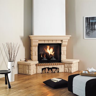 Угловой камин со срезанными краями из золотисто-песочного камня Edelroc + каминная плита из огнеупорного кирпича. Каминная балка позволяет ставить различные предметы. Кожух устанавливается отдельно.