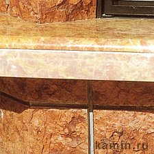 Волнистый по форме камин из белого камня, обработанного бучардой, с мраморным столиком Rosso Alhambra.
