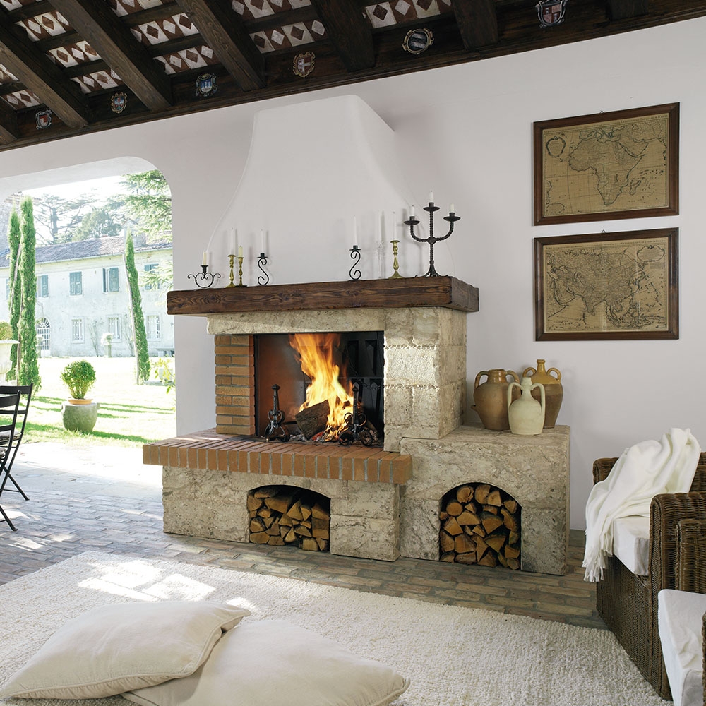 Облицовка из античного камня с пилястрами из кирпичей ручной работы. Балка - состаренная сосна.