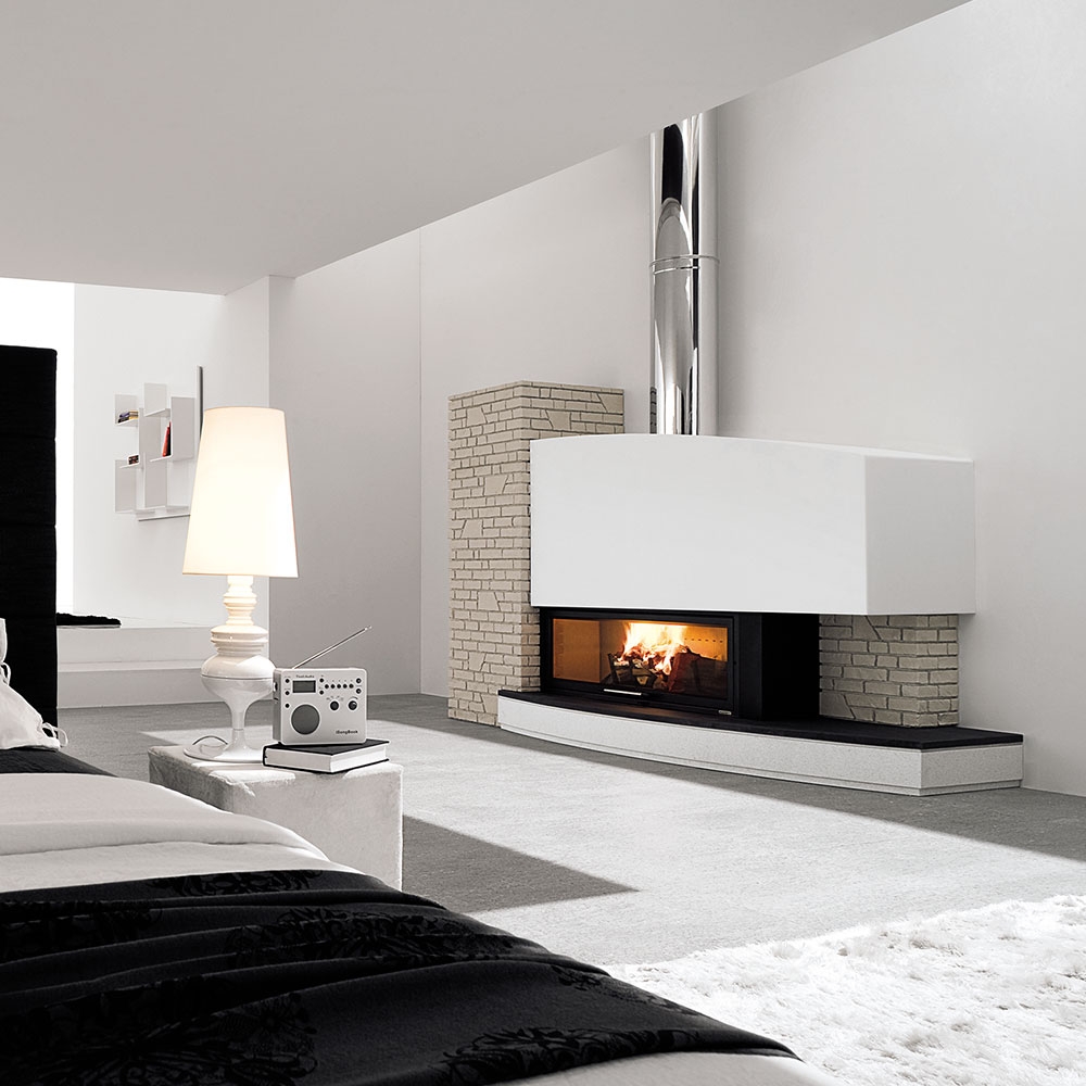 Выполнена из белого мрамора. Столешница из полированного мрамора Bianco Mediterraneo или черного Slate. Цоколь версий для топок с вентиляцией выше на 10 см.