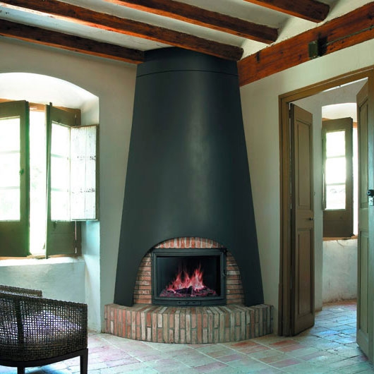 Угловой камин с круглым основанием и закладными деталями из кирпича со швом. Металлический короб конической формы черного цвета (высота от пола до потолка 2,60 м) и чугунная топка с круглым стеклом Premier Curvo.
