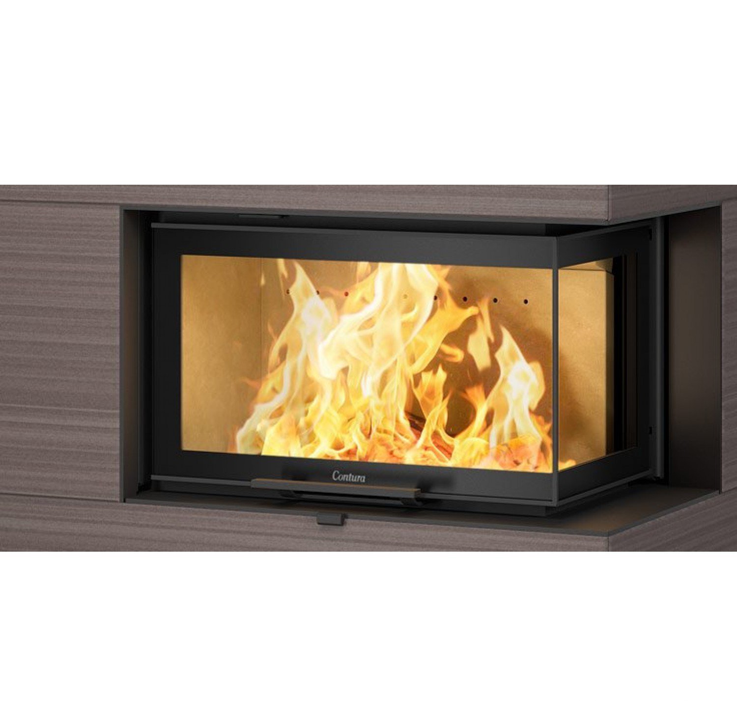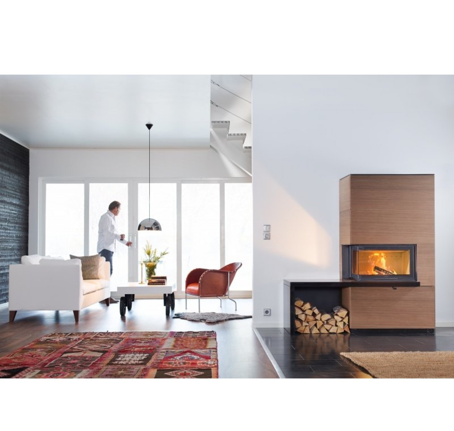 Камин Contura i41S оснащен угловой дверцей, которая при открытии поднимается вверх и влево или вправо,в зависимости от ваших пожеланий. Отделка камина из натурального камня - песчаника. Песчаник приятного орехового цвета, с красивым жилкованием. Камин можно дополнить скамьей с местом для хранения дров или декоративными деталями из черного гранита. Большая стеклянная дверца создает ощущение открытого огня. Благодаря системе "чистое горение" дверца всегда остается чистой, и вы можете любоваться огнем не думая о загрязнении камина или дымохода копотью и сажей. Использование современных технологий, обеспечивающих хорошее горение, позволяет получить больше тепла.